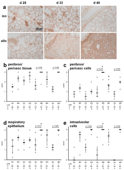 Accumulation of immunoglobulins (Ig) in lung tissue. Antisera directed to rat Ig were applied to paraffin sections of pulmonary isografts (iso) and allografts (allo). Grafts were investigated on postoperative day 28 (d 28) before intratracheal instillation of lipopolysaccharide (LPS) or phosphate-buffered saline (PBS), as well as on postoperative days 29 (d 29), 33 (d 33), and 40 (d 40), 1, 5 and 12 days after treatment with LPS, respectively. Immunopositive regions and cells are stained in brown, and cell nuclei are lightly counterstained with hemalum (a). The intensity of Ig deposits in peribronchiolar/perivascular (peribron/perivasc) tissue (b), the abundance of Ig-positive cells in peribronchiolar/perivascular regions (c), the intensity of Ig deposits on the luminal surface of the respiratory epithelium (d), and the abundance of Ig-positive cells in alveoli (e) were evaluated using a scoring system ranging from 0 for virtually no immunoreactivity to 3, the strongest immunoreactivity observed. Data are presented as individual data points, bar represents median, whiskers encompass the 25th to 75th percentile. Explorative data analysis was performed using Kruskal–Wallis test followed by Mann–Whitney U-test; * p ≤ 0.05, different from allo d 28, # p ≤ 0.05 allo d 33 PBS versus allo d 33 LPS.