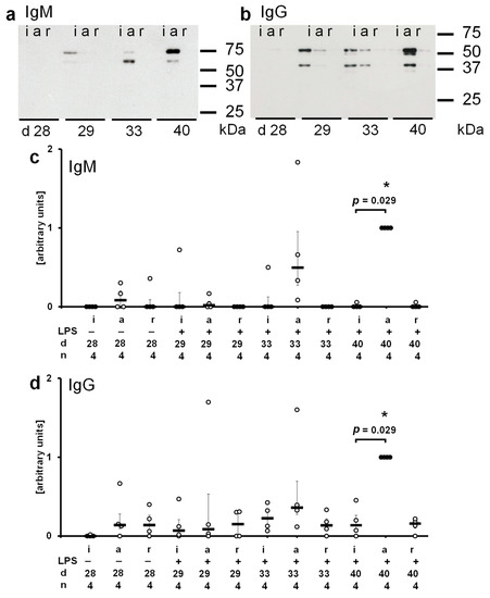 Accumulation of immunoglobulin (Ig) M and IgG in lung tissue. Protein extracts of pulmonary isografts, allografts, and right native lungs of allograft recipients (i, a, r) were separated on SDS polyacrylamide gels (10%) along with molecular mass standards. Proteins were blotted and probed with antibodies directed to rat IgM or rat IgG. Postoperative day 28 (d 28) before intratracheal instillation of lipopolysaccharide (LPS) as well as on postoperative days 29 (d 29), 33 (d 33), and 40 (d 40), 1, 5, and 12 days after treatment with LPS, respectively, were investigated. Representative Western blots for IgM (a) and IgG (b) are depicted (n = 4 each). A semiquantitative, densitometric analysis was performed and the results are depicted for IgM and IgG in (c) and (d), respectively. Data are presented as individual data points, bar represents median, whiskers encompass the 25th to 75th percentile. Explorative data analysis was performed using Kruskal–Wallis test followed by Mann–Whitney U-test; * p ≤ 0.05, different from d 28 allografts.