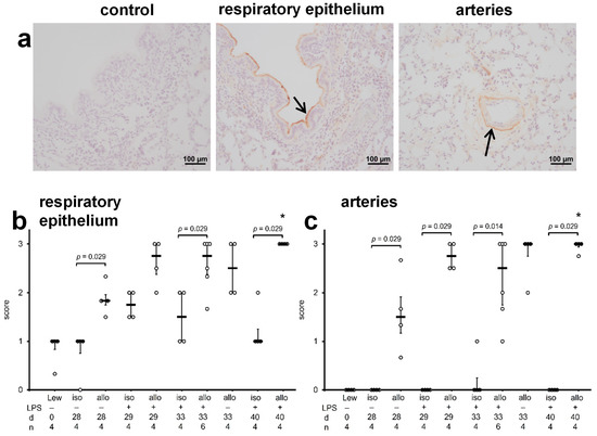 Deposition of C4d in lung tissue. C4d was detected by immunohistochemistry on paraffin sections of pulmonary isografts (iso) and allografts (allo). Grafts were investigated on postoperative day 28 (d 28) before intratracheal instillation of lipopolysaccharide (LPS) as well as on postoperative days 29 (d 29), 33 (d 33), and 40 (d 40), 1, 5, and 12 days after treatment with LPS, respectively. Immunopositive regions are stained in brown, and cell nuclei are lightly counterstained with hemalum. Examples of sections of d 40 allografts are depicted (a). In the section labeled control, the primary antibody was omitted (a). Further, examples showing C4d deposits on the respiratory epithelium (arrow) and on the arterial wall at the interface between media and intima (arrow) are depicted (a). The intensity of the C4d immunoreactivity on the respiratory epithelium and in the arterial wall was evaluated using a scoring system ranging from 0 for virtually no immunoreactivity to 3, the strongest immunoreactivity observed (b,c). Data are presented as individual data points, bar represents median, whiskers encompass the 25th to 75th percentile. Explorative data analysis was performed using Kruskal–Wallis test followed by Mann–Whitney U-test; * p ≤ 0.05, different from allo d 28.
