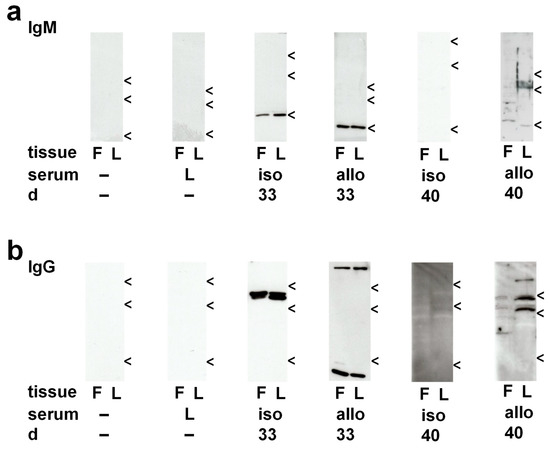 Immunoreactivity of sera from lung transplant recipients on Western blots of protein extracts of native Fischer-344 (F) and Lewis (L) rat lungs. Representative examples showing immunoreactivity of IgM (a) and IgG (b) of sera from native Lewis rats (L) and isogeneic (iso) or allogeneic (allo) lung transplant recipients on postoperative days 33 (d 33) and 40 (d 40), 5 and 12 days after treatment with LPS, respectively. Arrows indicate molecular masses: 75 kDa, 50 kDa, 25 kDa in top to bottom order.
