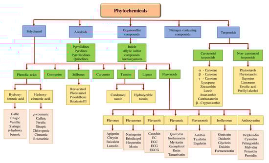 Phytochemicals may be categorized as polyphenols, alkaloids, terpenoids (carotenoid terpenoids and non-carotenoid terpenoid), organosulfur compounds, and nitrogen-containing compounds based on their biosynthetic origins [29,30,31]. Classification of dietary phytochemicals is shown in Figure 1. Polyphenols constitute the largest group among these phytochemicals. There is increasing evidence demonstrating the ability of phytochemicals to decrease inflammation, slow the growth rate of cancer cells, reduce the formation of carcinogenic compounds, regulate gene expression and hormones’ intracellular signaling, enhance the immune system, alleviate DNA damage, decrease oxidative destruction of cells, and activate insulin receptors [32,33,34].