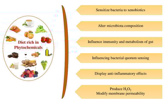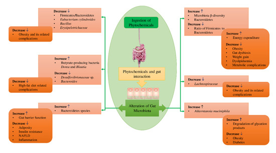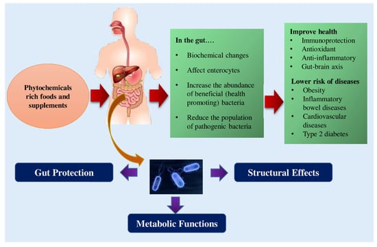 Compared to the micro- and macro-nutrients, the bioavailability of phytochemicals is very low within the human body due to their complex chemical structure and to their being metabolized as a xenobiotic [35]. The poor absorption of phytochemicals leads to extended retention times in the intestine where they may play a beneficial role by influencing the intestinal ecology [36]. During the last two decades, the influence of dietary phytochemicals on GI microbial population and the fundamental mechanisms assumed for their favorable effects on extra-intestinal and GI disorders have been illustrated [37,38,39]. However, there is a need to comprehensively review recent studies related to the impact of phytochemicals on gut microbiota of humans and their mechanism of action, including their relationship with metabolic diseases. This review mainly covers the effects of phytochemicals on the modulation of the gut microbiota environment and the resultant benefits to human health to establish clear directions for their potential use in human diets; however, the effect of phytochemicals on gut microbiota modulation of animals is also covered, in brief.