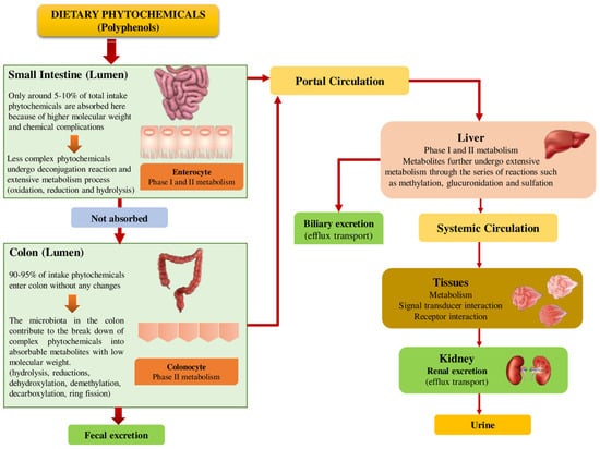 Considering polyphenols as an example, following absorption by the small intestine, a sequence of conjugated metabolites (water-soluble derivatives of sulfate, glucuronide, and methyl compounds) is produced in the hepatocytes and enterocytes, called Phase I. Phase I is a complex process that involves hydrolysis, oxidation, and reduction reactions. Phase II is the biological conversion of polyphenol compounds to hydrophilic metabolites through conjugation by either membrane bound or soluble cytosolic enzymes, which is less complex [65].