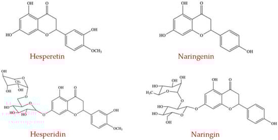 Citrus fruits are the richest source of dietary flavanones for humans, while aromatic herbs (mint) and tomatoes contain flavanones, but in lower percentages [81]. Although flavanones are found in limited amounts in the diet, they are also one of the main dietary flavonoids since citrus fruits and juices are frequently consumed worldwide. Naringenin and hesperetin (Figure 5) are the most abundant flavanones present in grapefruit and sweet oranges, respectively, and are the primary reason for their specific bitter taste [82].
