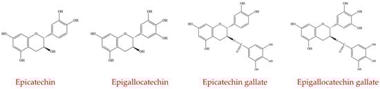 The flavanol subgroup is primarily composed of catechins, which are present in higher concentrations in the fruit’s skin as opposed to the pulp of the fruit. Catechins are found at high concentrations in green tea and are responsible for several health benefits of green tea. Although there are several compounds included in this group, only epicatechin, epigallocatechin, epicatechin gallate, and epigallocatechin gallate (Figure 6) are reported to affect the intestinal community [31].
