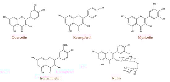 Chemical structures of flavonols (quercetin, kaempferol, myricetin, isorhamnetin, and rutin) (self-generated).