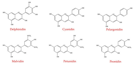 Anthocyanins belong to the flavonoids group of polyphenols. They are plant pigments imparting deep red/purple/blue colors in plant-derived food products [128]. Although anthocyanins are naturally present in the form of aglycones and glycosides of flavylium (2-phenyl benzopyrylium) salts, they are different from the structure of the salts [129]. It is reported that approximately 700 anthocyanin compounds have been identified and isolated from plants, but only 6 anthocyanidins are widely studied, namely delphinidin, cyanidin, pelargonidin, malvidin, petunidin, and peonidin (Figure 10) [130].