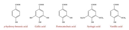 Chemical structures of hydroxybenzoic acids (p-hydroxybenzoic acid, gallic acid, protocatechuic acid, syringic acid, and vanillic acid) (self-generated).