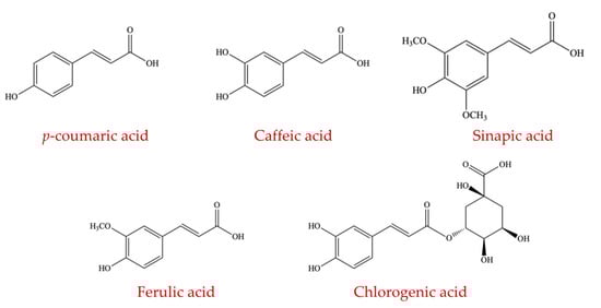 Hydroxycinnamic acids (HCAs) are the most abundant phenolic acids in plants [155]. The major factor contributing to this is that HCAs are attached to the cell walls of plants [156]. Many enzymes needed for the hydrolysis and metabolism of the complex structure of this polyphenolic compound are not present in the human genome [157]. However, these glycans can be fermented by the anaerobic intestinal microflora, where different micro-organisms liberate HCAs in the human intestine, thus considerably impacting human health [59,158]. Hydroxycinnamic acids contain a wide range of compounds, such as caffeic acid, p-coumaric acid, sinapic acid, chlorogenic acid, and ferulic acid (Figure 13) which are all recognized to manipulate the intestinal ecosystem [159].