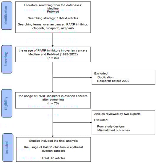Figure 1 is a flowchart of the searching, screening, and including process of the references we selected from the literature. In this review, all of the reference articles were retrieved from the databases Medline and PubMed using the searching terms “ovarian cancer”, “PARP inhibitor”, “olaparib”, “rucaparib”, and “niraparib” for the research topic. In this stage, only full-text articles were considered to be included for further analysis. Up to 31 March 2022, we searched potential articles in the literature from the databases Medline and PubMed. In the second stage, duplicated articles and articles prior to 2005 were excluded after screening. The literature published from 1 January 1992 to 31 March 2022 has been searched to identify eligible articles for review. In the next stage, two experts in the field independently inspected the contents of articles, including demographics, research designs, and outcomes, and identified potentially eligible studies for inclusion. The retrieved articles with poor research designs or mismatched outcomes were excluded at this stage. The discrepancies between the two experts were discussed through their mutual communication to reach a consensus. All eligible articles were included in the review using the searching terms and strategies (database searching, screening, selection, and inclusion of eligible articles). Ultimately, a total of 40 articles were collected for review.