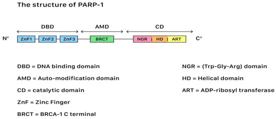 In terms of genetic repair for DNA damages, Poly (ADP-ribose) polymerases (PARP) belong to a family of 17 proteins that play critical roles in different stages of cellular life cycles, including the stress response, chromatin modification, DNA repair, and apoptosis induction (cell death). Among all kinds of PARP, PARP-1 is the most important member due to its role in the DNA repair pathways. Figure 2 shows the structure of PARP-1.