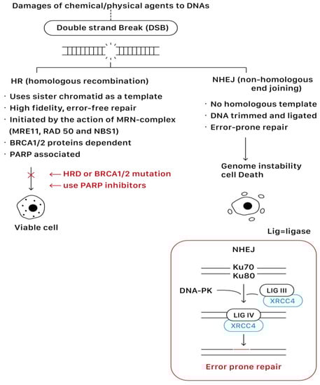 Homologous recombination (HR) and non-homologous end joining (NHEJ) are two main pathways to resolve double-strand breaks (DSBs). HR predominates instead as a mechanism of DNA repair during the S or G2 phase of the cell cycle when a sister chromatid is available to use as a template for in situ repair, in which nucleotide sequences are exchanged between two similar or identical molecules of DNA. It is a high-fidelity, error-free form of DNA repair mechanism and requires functional BRCA proteins for repairing DSBs. In contrast, NHEJ is active throughout all phases of the cell cycle, and it does not require a homologous template that the DNA is simply trimmed and ligated. Given the lack of a contrast template strand, NHEJ is a faster but error-prone mechanism of DNA repair [,]. This error-prone DNA repair often predisposes to genome instability and cell death. Figure 4 shows the repairing process of DSBs via the HR and NHEJ pathways.