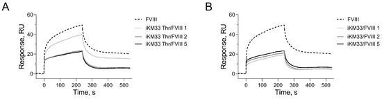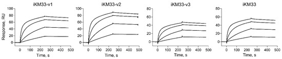 To verify that the structural modifications did not affect the protein’s affinity for FVIII, the generated iKM33 variants were evaluated for FVIII binding. Each protein was immobilized and probed with FVIII in solution using surface plasmon resonance (SPR). All scFv variants including parental iKM33 demonstrated a similar high affinity to FVIII (0.8–1 nM KD) (Figure 2), consistent with that found previously [34]. Thus, the structural modifications of iKM33 did not affect its affinity to FVIII.