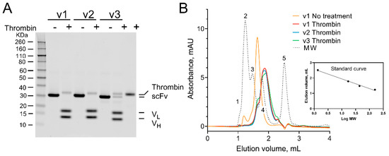 Cleavage of iKM33 variants by thrombin. The scFv variants were incubated with thrombin for 10 min at 37 °C. The samples of iKM33-v1 (v1), iKM33-v2 (v2), and iKM33-v3 (v3) were treated with 0.05 µg of thrombin per 1 µg of protein substrate. The reactions were stopped by adding PPACK. The parental iKM33 (31 kDa) was found not to be cleavable in preliminary experiments. (A) The samples with (+) and without thrombin cleavage (−) were loaded on SDS-PAGE gels (3 µg protein per well), and the gel was stained by Coomassie blue. The bands of VH (~13 kDa) and VL (~17 kDa) were identified based on their theoretical molecular weight. (B) SE-FPLC analysis of the thrombin-cleaved samples. MW—elution profile of molecular weight markers: thyroglobulin bovine 670 kDa (1), γ-globulin bovine 158 kDa (2), ovalbumin chicken 44 kDa (3), myoglobin horse 17 kDa (4), and vitamin B12 1.35 kDa (5). The insert shows a standard curve based on the markers 2–5.