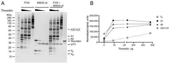 For evaluating the cleavage kinetics of the FVIII/scFv complex, we treated FVIII and iKM33-v2 separately and mixed with different thrombin amounts; the reactions were stopped with PPACK and analyzed by SDS-PAGE (Figure 4A). For thrombin-cleaved FVIII, the pattern of resulting fragments corresponded to the previously described [37,38]. For thrombin-cleaved scFv, fragments corresponded to VL and VH, consistent with Figure 3A. To assess the cleavage rates of each protein within their complex, the three cleavage fragments of FVIII (A1, A2, and A3-C1-C2) were tracked due to the presence of three thrombin cleavage sites within FVIII, while only VL of the scFv was tracked considering the presence of one thrombin cleavage site within it (Figure 4B). The results show that the cleavage rate of the sites within FVIII is higher than respective sites within the scFv. This indicates that additional determinants of FVIII contribute to its faster cleavage rates.