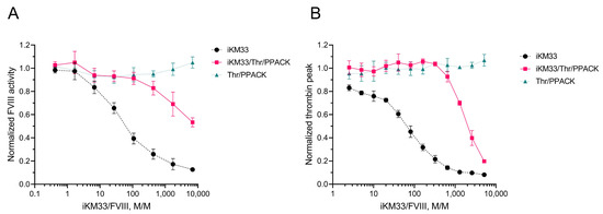 Effect of thrombin-cleaved iKM33-v2 on FVIII activity. (A) Three samples were prepared as (i) scFv, (ii) scFv treated with thrombin followed by termination of reaction by PPACK (scFv/Thromb/PPACK), and (iii) buffer treated with thrombin followed by addition of PPACK (control) (Thrombin/PPACK). Serially diluted samples (iKM33 concentration from 1000 to 0.24 nM) were incubated with FVIII (145 pM) and tested by CS assay. The results were normalized to FVIII incubated with thrombin-treated buffer. Mean ± SD, n = 4. (B) The samples were prepared similarly to panel A, but thrombin was removed from the reactions using biotinylated PPACK followed by incubation with streptavidin beads. Serially diluted samples (iKM33 concentration from 600 to 0.3 nM) were incubated with FVIII (116 pM) for 15 min and tested by TG assay. The results were normalized to FVIII incubated with Tris-BSA buffer (pH 7.2). Mean ± SD, n = 3.