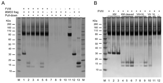Testing interactions between FVIII and isolated iKM33 subunits. The interaction was evaluated by a pull-down assay using FVIII (BDD), iKM33-v1, and its thrombin-cleaved fragments (as shown on top) and FVIII-affinity sorbent; the resulting samples were analyzed by SDS-PAGE followed by gel silver staining. (A) Lanes 1–10 contain the samples, and lanes 11–13 contain control proteins. Specifically, lanes 1–6 contain FVIII (~2 µg), lanes 1–5 and 7–9 contain the scFv and its fragments (used at 3-fold molar excess over FVIII in pull-down assay) as follows: lanes 1 and 7 contain the scFv; lane 2 contains the thrombin-cleaved scFv, lanes 3 and 8 contain the VH, lanes 4 and 9 contain the VL, and lanes 5 and 10 contain a mixture of the VH and VL. (B) Analysis of dose-dependence of the scFv fragments used in a similar experiment: lanes 1–12 contain FVIII (~2 µg), lanes 1–9 contain the scFv, thrombin-cleaved scFv, and a mixture of VH and VL. In each group shown on top, the molar ratio of FVIII to the scFv fragments increases as 1:1, 1:2, and 1:5. Lane 10 contains the VH and lane 11 contains the VL; both subunits were used at 5-fold molar excess over FVIII. In both panels, lane M contains a molecular weight marker. Each experiment was performed independently two times with similar results.