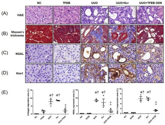 Figure 1. TFEB decoy ODN attenuated morphological changes and tubular injury in UUO-induced renal fibrosis in mice. (A) Paraffin-embedded kidney section stained with hematoxylin and eosin (H&E); (B) Masson’s trichrome staining; immunohistochemical staining showing the protein expression of (C) NGAL and (D) Kim-1 protein; (E) quantification of collagen, NGAL, and Kim-1 expressions. Quantitative analysis of collagen or protein expression area of each group (n = 3; 400× magnification). Original scale bar = 20 μm. The results are expressed as mean ± SE of three independent experiments. * p < 0.05 vs. the NC group. † p < 0.05 vs. the TFEB group. ‡ p < 0.05 vs. the UUO or Scr group. NC, normal control group; TFEB, TFEB decoy injection in the normal control group; UUO, UUO surgery group; Scr, scramble ODN injection in the UUO surgery group; UUO + TFEB, TFEB decoy ODN injection in the UUO surgery group; UUO, unilateral ureteral obstruction; decoy ODNs, decoy oligonucleotides; TFEB, Transcription factor EB; Scr, scrambled.