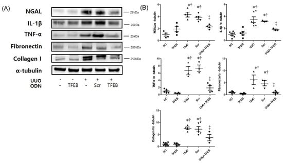 Figure 2. Synthetic TFEB decoy ODN significantly suppressed renal inflammation, fibrosis, and collagen deposition in UUO mice. (A) Western blotting showing NGAL, inflammatory cytokines (IL-1β, TNF-α), fibronectin, and collagen I expression in kidney tissue; (B) quantification of the protein expression levels of the Western blot images using Image J program. The results are expressed as mean ± SE of three independent experiments. * p < 0.05 vs. the NC group. † p < 0.05 vs. the TFEB group. ‡ p < 0.05 vs. the UUO or Scr group. NC, normal control group; TFEB, TFEB decoy injection in the normal control group; UUO, UUO surgery group; Scr, scramble ODN injection in the UUO surgery group; UUO + TFEB, TFEB decoy ODN injection in the UUO surgery group; UUO, unilateral ureteral obstruction; decoy ODNs, decoy oligonucleotides; TFEB, Transcription factor EB; Scr, scrambled; IL-1β, interleukin-1β; tumor necrosis factor-α (TNF-α).