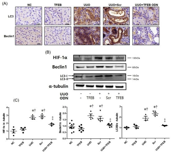 Figure 3. TFEB decoy ODNs decreased the expression of autophagic markers in UUO-induced renal injury. TFEB decoy ODN inhibits the expression of autophagy genes in UUO-induced renal fibrosis. (A) Immunohistochemical staining shows that the expressions of LC3 and Beclin1 proteins were reduced via TFEB decoy ODN administration in UUO-induced renal fibrosis mice. Original scale bar = 20 μm. (B) Western blot analysis shows that TFEB decoy ODN decreased the expression of HIF-1α, Beclin1, and LC3. (C) Quantification of the protein expression levels of the Western blot images using the Image J program. The results are expressed as mean ± SE of three independent experiments. * p < 0.05 vs. the NC group. † p < 0.05 vs. the TFEB group. ‡ p < 0.05 vs. the UUO or Scr group. NC, normal control group; TFEB, TFEB decoy injection in the normal control group; UUO, UUO surgery group; Scr, scramble ODN injection in the UUO surgery group; UUO + TFEB, TFEB decoy ODN injection in the UUO surgery group; LC3, microtubule-associated protein light chain 3; HIF-1α, hypoxia-inducible factor-1α; UUO, unilateral ureteral obstruction; decoy ODNs, decoy oligonucleotides; TFEB, Transcription factor EB; Scr, scrambled.