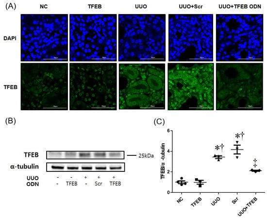 The effect of TFEB ODN on TFEB expression in UUO mice. (A) Immunofluorescence staining for TFEB (green). Cells were counterstained with Hoechst 33342 (blue). Original scale bar = 20 μm. (B) Western blot analysis shows that TFEB decoy ODN decreased TFEB expression. (C) Quantitative analysis of TFEB expression in each group, performed at a magnification of 400×. Data are presented as mean ± SEM (n = 3). Tukey’s multiple comparison test, * p < 0.05 vs. the NC group. † p < 0.05 vs. the TFEB group. ‡ p < 0.05 vs. the UUO or Scr group. NC, normal control group; TFEB, TFEB decoy injection in the normal control group; UUO, UUO surgery group; Scr, scramble ODN injection in the UUO surgery group; UUO + TFEB, TFEB decoy ODN injection in the UUO surgery group; DAPI, 40, 6-diamidino-2-phenylindole; UUO, unilateral ureteral obstruction; decoy ODNs, decoy oligonucleotides; TFEB, Transcription factor EB; Scr, scrambled.