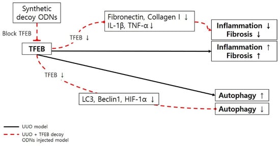 In summary, we designed a novel synthetic noncoding RNA targeting TFEB, a transcription factor known to induce fibrosis and inflammatory responses. We confirmed that TFEB decoy ODN administration in a UUO mouse model reduced fibrosis and autophagy (Figure 5). The TFEB decoy ODNs also showed anti-inflammatory effects. Collectively, our results suggest that TFEB may be involved in the regulation of autophagy and fibrosis and that regulating TFEB activity may be a promising therapeutic strategy against kidney diseases. However, further studies are needed to better understand the function and mechanism of TFEB in the treatment of CKD.