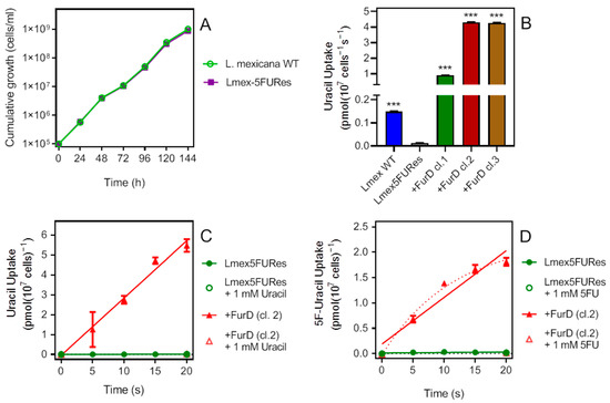 AnFurD differs from the other heterologously expressed transporters used in this study, in that it is a member of the NCS1 gene family [46] rather than the ENT transporter family, which, to date, has not been found in any protozoan species [47,48]. Figure 7A shows that promastigotes of the L. mexicana WT and the derived 5FURes strain displayed the same growth rate in standard HOMEM medium. The expression of this Aspergillus transporter greatly increased uracil uptake in all three clonal strains tested (p < 0.0001), very much above even the level in WT L. mexicana (Figure 7B). Over 20 s, uracil was very robust in the cells expressing FurD but virtually undetectable in the Lmex5FURes at 0.02% of the rate (Figure 7C). Similarly, uptake of 5FU was rapid in the +FurD cells but not significantly different from zero in the control (Figure 7D). The nonlinearity of the FurD-expressing cells for 5FU uptake can be ascribed to a low rate of metabolic incorporation of 5FU compared to uracil, allowing a buildup of the free substrate in the cell. The Km for uracil was determined at 0.89 ± 0.20 µM and the Ki for 5FU as 0.70 ± 0.25 µM, showing that the transporter does not discriminate by binding affinity between the two substrates (p = 0.65) (Figure 7E). This compares with a reported Km of 0.45 µM for uracil and Ki of 0.46 for 5FU in A. nidulans [30], showing that L. mexicana is an excellent expression system for Aspergillus transporters.