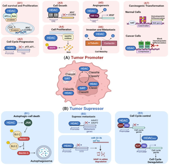 HDACs as tumor promoters and suppressors. (A) HDACs are overexpressed in cancer, which promotes cellular proliferation and suppresses apoptosis and cell cycle arrest. (A1) Some HDACs (e.g., HDAC2) stabilize the beta-catenin complex, boosting cell survival and proliferation. (A2) HDACs are involved in the disruption of cell cycle checkpoints by obstructing the expression of tumor suppressor genes such as p53 and p21. (A3) Certain HDACs, such as HDAC1, reduce the transcription activity of estrogen receptor-α (ER-α), resulting in growth promotion. (A4) HDACs (e.g., HDAC6) increase the activation of MAPK through inducing the production of reactive oxygen species (ROS) via NADPH oxidase, thus promoting cell proliferation and survival. (A5) Under hypoxia, HDACs (e.g., HDAC1) stabilize HIF-1α through deacetylation, which, in turn, activates the transcription of genes involved in oxygen delivery, energy metabolism, angiogenesis, and apoptosis. (A6) The deacetylation of cell motility proteins (tubulin and cortactin) by HDACs (e.g., HDAC6) drives the progression of a primary tumor to invasion and metastasis. (A7) In hematological malignancies, PML-RAR oncofusion proteins act as altered transcription factors, which aberrantly recruit HDACs to the promoter site of retinoic acid (RA) genes, thus suppressing myeloid differentiation and causing malignant transformation. (B) Some HDACs have tumor suppressor activities and they are genetically downregulated in cancer. (B1) HDACs suppress tumor growth through activating JNK-mediated Beclin1 dissociation from Bcl-2 to induce caspase-independent autophagy death. (B2) HDACs (e.g., HDAC10) inhibit invasion and metastasis through reducing the histone acetylation level at the promoter sites of the matrix metalloproteinases (MMP2 and MMP9) genes, thereby suppressing their expression. Additionally, HDACs (e.g., HDAC2) suppress cancer metastasis through inhibiting expression of LncRNA H19, a miR-22-3P sponge that upregulates the expression of MMP14, by histone H3K27 deacetylation at its promoter site. (B3) Some HDACs (e.g., HDAC1) are involved in cell cycle regulation by forming a complex with E2F and RB that represses cell cycle progression genes. Mutations in HDAC1 reduce its recruitment and binding to E2F-regulated promoters, thereby reducing their interaction with retinoblastoma protein (Rb). This results in preventing the repression of cell cycle genes by retinoblastoma (Rb). Abbreviations: APC, adenomatous polyposis coli; TSG, tumor suppressor gene; ER, estrogen receptor; ERE, estrogen response element; ROS, reactive oxygen species; MAPK, mitogen-activated protein kinase; HIF-1α, hypoxia-inducible factor-1; HRE, hypoxia-response element; VEGF, vascular endothelial growth factor; RAR, retinoic acid receptor; PML, promyelocytic leukemia; HAT, histone acetyltransferase; JNK, c-Jun N-terminal kinases; Bcl-2, B-cell lymphoma 2; MMP, matrix metalloproteinases; miR, microRNA; Rb, retinoblastoma.