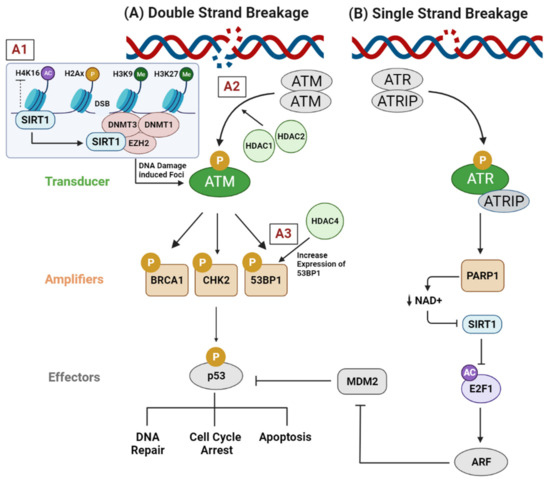 Ataxia-telangiectasia mutated (ATM) protein has a leading role in the DNA damage response. ATM stimulates the activation of the BRCA1, CHK2, and p53 genes, leading to cell cycle arrest and DNA repair through the activation of the CDKN1A (p21), GADD45A, and RRM2B genes [36]. Over-activation of ATM promotes the adaptation of cancer cells to genotoxic stress. Conversely, impaired ATM function exhibits chromatin exposure and augments genomic instability, which enhances sensitivity to DNA-damaging modalities (e.g., irradiation, and chemotherapeutics) [37]. It was demonstrated that selective depletion of HDAC1 and HDAC2 was sufficient to reduce ATM activation, thus toning down the subsequent phosphorylation of BRCA1, CHK2, and p53 and increasing the susceptibility to DNA break induction in several tumor types [36]. Interestingly, the silencing of HDAC4 by RNA interference downregulated the level of 53BP1 protein, a well-known tumor suppressor protein that participates in the early steps of the DNA-damage-signaling pathways, which abrogated the DNA-damage-induced G2/M checkpoint arrest and increased the radiosensitivity of HeLa cells (Figure 2A). Thus, HDAC4 was proposed to have a prominent role in cell cycle regulation after ionizing radiation [38]. Furthermore, yeast SIR3 has been shown to be prominently recruited at various sites of DNA damage. The accumulation of this type of deacetylase has been hypothesized to facilitate DNA repair and to protect the unrepaired DNA ends through induction of compact chromatin alignment [39]. In a similar manner, SIRT1 has been identified as a major player in the DNA damage response, acting as a deacetylase of proteins involved in DNA repair at sites of DNA damage [40]. Moreover, SIRT1 functions as an enhancer of DNMT1, DNMT3B, and zeste homologue 2 (EZH2). These proteins are recruited at sites of DNA double strand breaks and induce histone repressive modifications such as hypoacetylation of H4K16, H3K9me2/me3, and H3K27me3. These histone modifications help in the establishment of the compact chromatin around the damaged site by forming a silencing complex with DNMT3b, polycomb, and a repressive complex of four components (SIRT1 and EZH2) that pairs with γH2AX, forming DNA-damage-induced foci (Figure 2A) [41]. In addition to H4K16 deacetylation, SIRT1 was reported to deacetylate a member of the HAT family called hMOF (human MOF), which consequently affected its recruitment at sites of DNA damage and caused downregulation of DNA double strand break repair genes such as BRCA2, RAD50, and FANCA in human colorectal cancer cells (HCT116) [42]. On the other side, SIRT1, along with E2F1 transcription factor, are stimulated among the signaling cascade initiated by DNA single strand break molecular sensor PARP1 to guide the transcription of ADP-ribosylation factor (ARF), which is one of the crucial genes that are modulated in response to continuous DNA breaks (Figure 2B) [43,44].