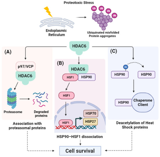 Cytoplasmic HDAC6 was found to represent a master chief in the regulation of the cytoprotective response to proteotoxic stress through association with proteasomal proteins (Figure 3). For instance, HDAC6 forms a complex with p97/VCP and UFD3/PLAP, which are involved in controlling the ubiquitin/proteasome system. P97/VCP is a chaperone that facilitates the degradation of misfolded proteins when the ubiquitin-dependent proteasomal turnover of proteins is overwhelmed and paralyzed (Figure 3A) [54,55]. In addition, HDAC6 induces the expression of dominant chaperons in response to the accumulation of ubiquitinated protein aggregates. Initially, HDAC6 senses the abnormal accumulation of ubiquitinated misfolded proteins via its ubiquitin-binding activity. Consequently, it promotes the dissociation of a repressive HDAC6/heat-shock factor 1 (HSF1)/heat-shock protein 90 (HSP90) complex, where the liberated HSF1 activates HSP gene expression to induce cell survival (Figure 3B) [20,56,57]. Accordingly, HDAC6 inhibition has been shown to increase the acetylation of HSP90 and suppress its function as a molecular chaperon, which increases the number of misfolded proteins in the cell (Figure 3C). When the rate of misfolded proteins exceeds the processing or folding capacity of protein chaperones, it will result in chronic unresolved ER stress and subsequent apoptosis induction in cancer cells [20]. In addition to HSP90, HDACIs increased the acetylation levels of other chaperones such as regulated protein 78 (GRP78), which causes the induction of protein misfolding and proteotoxic stress, leading to the suppression of cellular proliferation and subsequent apoptosis. On the other hand, HDACIs can induce ER stress in cancer cells indirectly through the upregulation of the reversion-inducing cysteine-rich protein with Kazal motifs (RECK) gene, which is a well-known member of the metastasis suppressor genes that was found to modulate tumor cell invasiveness and metastasis. The upregulation of RECK was found to sequester GRP78, which releases ER transmembrane sensor proteins to eventually induce ER stress and activate apoptosis [52,58,59,60,61]. Collectively, these studies present a new HDAC-targeted approach in limiting metastasis and angiogenesis and in increasing the susceptibility of cancer cells to ER stress through induction of the intracellular proteotoxic environment [62].