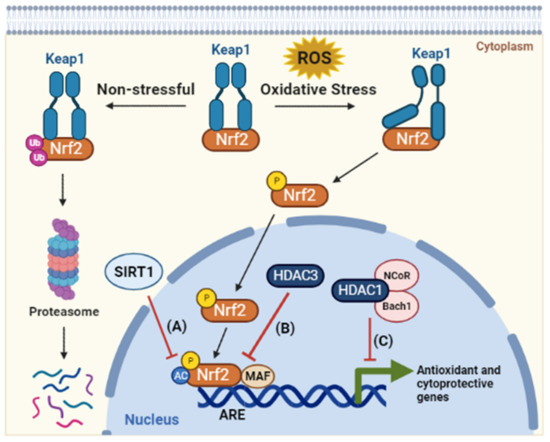 HDACs coordinate the cellular response to oxidative stress. HDACs coordinate the cellular response to oxidative stress. As a defense mechanism against oxidative stressors, Nrf2 acts as a redox-sensitive transcription factor. Under homeostatic conditions, Keap1 sequesters Nrf2 in the cytoplasm, resulting in its degradation by proteasome. When the cells are subjected to oxidative stress, Nrf2 is activated through its dissociation from the Keap1 complex. Then, the Nrf2 protein is transported to the nucleus, where it is acetylated and dimerized with the MAF protein at the antioxidant reactive element (ARE) site in the promoters of antioxidant genes. Through this process, antioxidant genes are activated to scavenge excess reactive oxygen species (ROS) and maintain mitochondrial function. In response to oxidative stress, HDACs act as a negative regulator of the Nrf2 pathway. (A) SIRT1 inhibits Nrf2 acetylation, which reduces its binding to ARE and thereby obstructs Nrf2-mediated gene expression. (B) HDAC3 is recruited to the ARE site and induces a histone hypoacetylation state, hence repressing ARE-dependent gene expression. (C) HDAC1 forms a complex with Bach1, which competes with Nrf2 for the binding to transcription cofactor MAF in oxidative-stress-response genes. Bach1 acts as a functional inhibitor of Nrf2 by forming a complex with nuclear co-repressor NCoR. Abbreviations: Nrf2, NF-E2–related factor 2; Keap1, Kelch-like ECH associated protein 1; ROS, reactive oxygen species; MAF, musculoaponeurotic fibrosarcoma; ARE, antioxidant responsive element; Bach1, BTB domain and CNC homolog 1; NCoR, nuclear receptor corepressor 1.