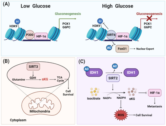 Despite the negative regulation of glycolysis by SIRT6, SIRT3 and SIRT5 were found to contribute to cancer cell proliferation and survival in diffuse large B cell lymphoma and breast cancer by regulating the function of metabolic enzymes [86,87]. The depletion of SIRT3 in large B cell lymphoma blocks glutamine flux to the tricarboxylic acid (TCA) cycle through inhibition of glutamate dehydrogenase that results in the reduction of acetyl-CoA pools, which causes the induction of autophagy in cancer cells (Figure 5B) [87]. Similarly, the overexpression of SIRT5 in breast cancer protects the mitochondrial enzyme glutaminase (GLS) from ubiquitin-mediated degradation through SIRT5 dependent-desuccinylation of lysine164 residue, which stabilizes GLS [86]. Indeed, SIRT5-dependent GLS stabilization is the main mechanism by which SIRT5 promotes cancer cell growth and survival. The involvement of SIRT2 in supporting tumorigenesis through modulating metabolic pathways was also reported. SIRT2 regulates cellular metabolism and metastasis in colorectal cancer through deacetylation of isocitrate dehydrogenase 1 (IDH1), which plays an important role in glutamine metabolism. The increased deacetylation level of IDH1 at lysine 224 simulates its enzymatic activity and subsequently induces the generation of NADPH and glutathione (GSH), which protects cancer cells from ROS produced during their rapid proliferation rate (Figure 5C). In addition, IDH1 stimulation by deacetylation induces the proteasomal degradation of HIF-1α, which exerts a suppressive effect in colorectal cancer metastasis [88].