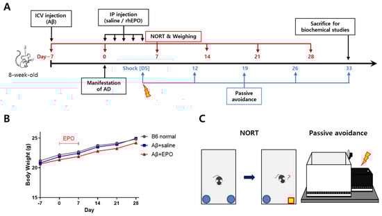 Erythropoietin (EPO) treatment and animal behavioral assessment design. (A) Whole in vivo experiment schedule: Beta amyloid-42 oligomer (Aβ) was injected into the intracerebroventricular (ICV) space at D7 (7 days before EPO treatment). Then, recombinant human EPO (rhEPO) or saline was injected daily via the intraperitoneal (IP) route for 5 consecutive days from D0. The novel recognition object test (NORT) was performed on a weekly basis, from D7 to D28. Body weight was measured right before every NORT. The passive avoidance acquisition phase (shock phase) was carried out 5 days after rhEPO injection. Then, step-through latency trials were performed 7, 14, 21, and 28 days after the shock phase to monitor the duration of the acquired memory from the shock. (B) Body weight gains of the three groups during the test periods were not significantly different (each group n = 8 to 10). (C) Depictions presenting two neurobehavioral assessment methods used in this study were: NORT and passive avoidance test.