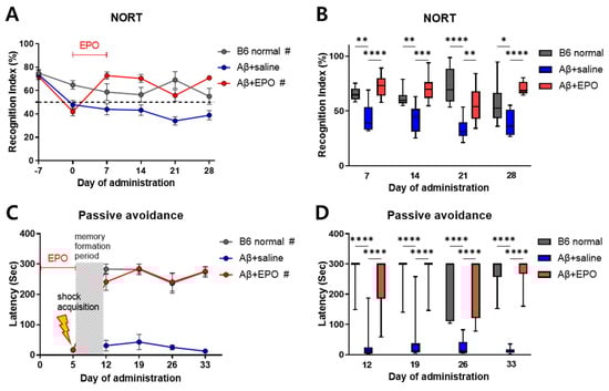 As for its possible use in treating AD, EPO has been reported to produce a neurotrophic effect that reduces pathologic abnormalities, including Aβ accumulation, oxidative stress, neurodegeneration, and neuroinflammation and repairs nerve damage in AD []. In the present research, to evaluate possible efficacy of EPO treatment in AD, firstly, neurobehavioral outcomes were evaluated in Aβ-induced AD model mice. Two representative behavioral analyses were used: NORT, a long-term memory test, and passive avoidance task, a long-term event-space memory assessment []. The ability to recognize a novel object was significantly improved in AD mice after rhEPO injection, in contrast to saline-injected disease controls (Figure 2). The recognition ability of the EPO-injected group was also enhanced to a level similar to that of B6 normal mice and was maintained for 28 days after initiation of rhEPO injection. In addition, in a passive avoidance task that set the shock acquisition phase after rhEPO administration, the Aβ+EPO group responded to shock with retained memory similar to the B6 normal control group for up to four following weeks, while the Aβ+saline group showed short latencies in the light room consistently due to loss of memory (Figure 2C,D). These contrasting behavioral outcomes in Aβ+EPO and Aβ+saline indicate that EPO shows therapeutic effects by ameliorating memory dysfunction. This is consistent with previous reports showing prevention and reversion of Aβ-induced learning and memory deterioration by EPO treatment, which was assessed using behavioral Morris Water Maze (MWM) []. Consequently, these results support the idea of EPO as a potential therapeutic strategy for pathological memory deficits produced by AD.