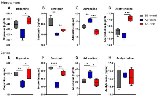 To further investigate whether EPO may regulate intracerebral neurotransmitters, we quantified the dopamine, serotonin, acetylcholine, and adrenaline concentrations in the brain tissue using ELISA assays (each group n = 4). Previous research has reported remarkable reductions in the concentrations of neurotransmitters, including glutamate and acetylcholine, in the hippocampi and neocortices of AD patients [,]. Dopamine, serotonin, adrenaline, and acetylcholine concentrations were measured in three groups of mouse brain tissue, dissected 4 weeks after EPO treatment (Figure 3). In both hippocampus and cortex, there were no differences in the levels of all quantified neurotransmitters between Aβ+EPO and B6 normal groups, while those of Aβ+saline showed lowered levels of serotonin in the hippocampus and the cortex and dopamine in the cortex. The adrenaline level showed a reversed pattern. Aβ+EPO mice exhibited increments in dopamine and serotonin levels and decrements in adrenaline in both hippocampus and cortex (p < 0.05) (Figure 3A–C,E–G). The level of acetylcholine was elevated by rhEPO administration only in the hippocampus of the AD model (Figure 3D). These results indicate the restoring effect of EPO treatment on neurotransmitter abnormality in AD mice, especially in terms of the serotonin level. Accordingly, as the next step, we decided to investigate the effects of EPO on the serotonergic pathway in the AD model, which is also expected to affect neurogenesis [].