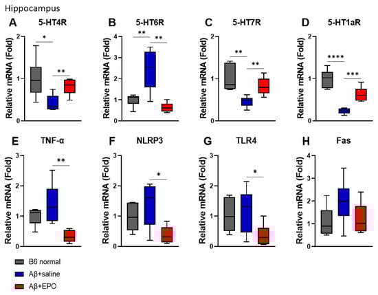 To determine whether EPO affects the serotonergic neuron system and neuroinflammation at the mRNA level, we performed a quantitative real-time PCR (qRT-PCR). Among the serotonin receptor genes known to be associated with AD in mouse hippocampus, 5-HT4, 5-HT6, 5-HT7, and 5-HT1a receptors were selected for the experiment. The agonists of 5-HT4R and 5-HT7R and the antagonist of 5-HT6R have been reportedly beneficial in AD []. Similarly, in this study, the mRNA levels of 5-HT4R and 5-HT7R in the Aβ+EPO group were upregulated but the Aβ+saline group (p < 0.01) showed downregulation of these receptors on AD induction (p < 0.05) (Figure 4A,C). Moreover, EPO-treated mice downregulated the 5-HT6R expression level, which was upregulated in the Aβ+saline group (p < 0.01) (Figure 4B). Receptor 5-HT1aR, also reported to be associated with neurogenesis, significantly decreased in Aβ+Saline mice and increased in Aβ+EPO injected mice (p < 0.0001) (Figure 4D).