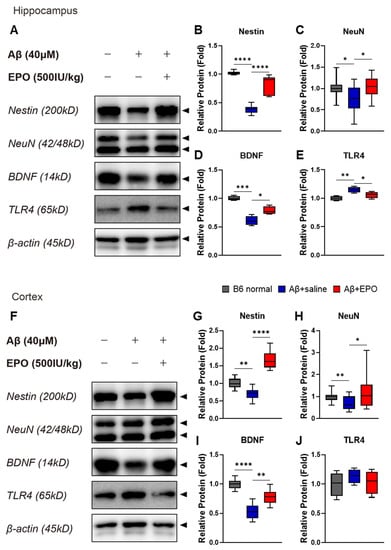 To determine the effect of EPO on the brain at the protein level, Western blots were performed with prepared bilateral hippocampal and cortical samples (Figure 5A,F). As indicators of neurogenesis and neuroprotection, protein expression levels of Nestin (Figure 5B,G), NeuN (Figure 5C,H), and BDNF (Figure 5D,I) were quantified using each antibody. Intensities of the antibody bands significantly increased in samples of the Aβ+EPO group compared to those of the Aβ+saline group (p < 0.05), which were downregulated by AD induction with lower values than normal control (p < 0.05). According to these findings, the IP injection of rhEPO exerted neurogenic and neuroprotective effects on the mouse brain damaged by Aβ oligomer. In the hippocampus, the protein expression of TLR4, which was upregulated on Aβ administration, decreased on EPO treatment (p < 0.05) (Figure 5E). All protein levels were normalized to β-actin. The result also indicates that EPO ameliorates neuroinflammation in AD.