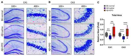 To further evaluate the neuro-regenerative effect of EPO, the pyramidal neuron layer of the hippocampus was visually confirmed through cresyl violet staining. All coronal sections were 20 μm thick, and the cresyl violet staining time was the same. They were also photographed at the same light exposure, preference, and magnification. Micrographs were taken in areas CA1 and CA3 at 100× and 400× magnifications (Figure 6A,B). Three tissue slices were analyzed for each mouse, and four mice per group were prepared. The Nissl-stained area in the CA1 region of the Aβ+saline mice appeared slightly hazy and thin compared to the B6 normal (Figure 6A). On the contrary, CA1 of Aβ+EPO was observed to be thicker than that of Aβ+saline. This pattern was much more evident in the CA3 region (Figure 6B). The differences between each group were significant when the total areas of the CA1 and CA3 regions were measured using the ImageJ program after thresholding the same intensity (Figure 6C; CA1, p < 0.01; CA3, p < 0.005). These staining image results strongly suggest that EPO repairs Aβ-induced neuronal damage and induces neurogenesis.