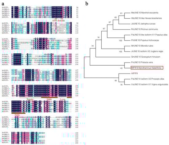 Multiple sequence alignment (a) and phylogenetic analysis (b) of MfPIF8 and several highly homologous bHLH proteins. (a) Identical and similar amino acids were highlighted. Conserved amino acid residues marked by red dots are active phytochrome B-binding (APB). The basic region was marked by the blank box, and the curve-linked red boxes indicate the conserved HLH domain. (b) Phylogenetic tree constructed using the neighbor-joining method. MfPIF8 is indicated by a hollow red box. The GenBank accession numbers and corresponding species for the sequences analyzed are listed in Table S1.