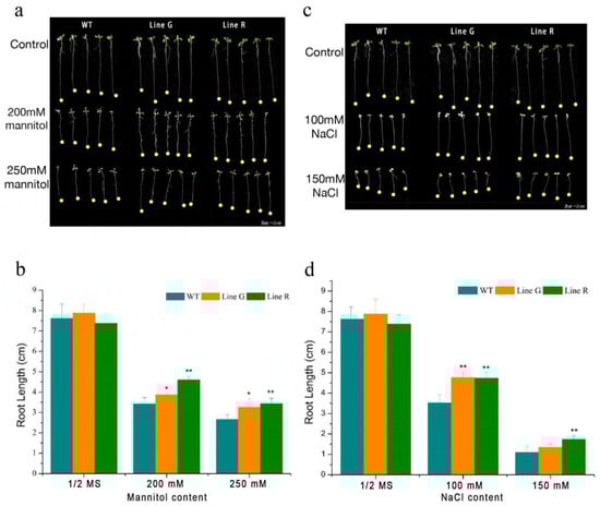 Increasing plant tolerance to drought and salt stress under adversity involves multiple complex biological processes, such as changes in morphology and physiological and biochemical effects. Roots can perceive and pass environment stress signals to the rest of the plant, which initiate morphological, physiological, biochemical, and molecular responses []. Additionally, under adverse environmental conditions, enhancing the growth of primary roots would offer an advantage to the plants by expanding their domains of water supply []. Therefore, root length is one of the important indicators of drought tolerance []. In the seedling osmotic and salinity stress tests, the primary roots of two OE lines were significantly longer than the WT seedlings, which may contribute to better water absorption capacity (Figure 2a,c).