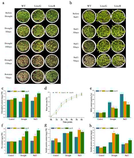 We measured changes of chlorophyll content before and after treatments. Our results show that WT and OE lines had similar chlorophyll content before treatment. However, under drought and salt treatments, OE lines G and R exhibited significantly higher chlorophyll contents, which were 1.22–1.45-fold and 1.25–1.48-fold those of the WT, respectively (Figure 3c).
