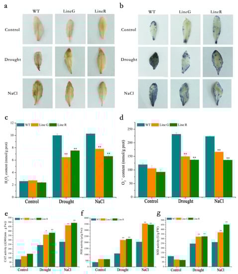 Exposure to abiotic stress causes the accumulation of excessive reactive oxygen species (ROS), such as hydrogen peroxide (H2O2), superoxide anion radical (O2−), etc., in plant cells, and leads to an increase in lipid peroxidation along with cell oxidative damage. To determine the levels of ROS in cells under drought and salinity stresses, we used 3, 3′-diaminobenzidine (DAB) and nitroblue tetrazolium (NBT) histochemical staining. Under normal condition, the leaves of WT and OE lines were stained in very light brown, or little leaf area was stained in blue by DAB and NBT, respectively. After drought treatment, the leaves of WT were stained in deeper brown by DAB than those of the two OE lines, while less leaf area of OE lines was stained in lighter blue compared with WT (Figure 4a,b). Consistent with these results, quantitative assay showed that the two OE lines accumulated less contents of H2O2 and O2− under both stresses (Figure 4c,d).