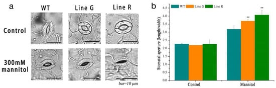 Approximately 90% of water loss (transpiration) occurs through stomata, and stomatal closure is the first step to reducing water loss by plants under drought stress [,]. Zhang et al. [] found that under drought conditions, the OE lines showed improved water-use efficiency by reducing their stomatal conductance and transpiration rate, indicating that overexpression of PtrWRKY75 enhanced the drought tolerance in poplars. In this study, the enhanced stomatal closure under mannitol treatment was found in MfPIF8 OE plants (Figure 5). This result is consistent with the lower WLR under both drought and salinity stresses (Figure 3d). Thus, the enhanced primary root length and stomatal closure increased water uptake and retention capacity, and therefore enhanced drought and salt tolerance.