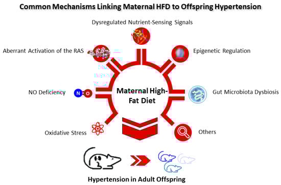 To date, several main mechanisms underlying hypertension of developmental origins have been proposed, such as oxidative stress, NO deficiency, aberrant activation of the RAS, dysregulated nutrient-sensing signals, epigenetic regulation, gut microbiota dysbiosis, etc. [14,57,58,76,77,78,79]. Among them, some are interconnected with maternal HFD and will be discussed in turn (Figure 2).