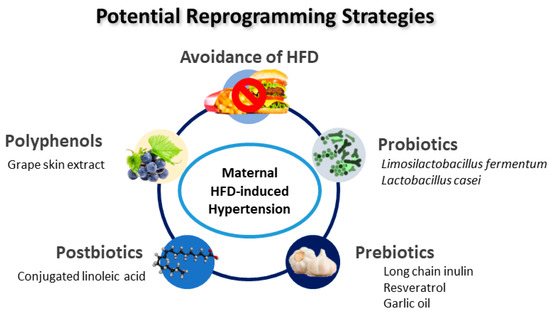 Animal models have been essential in providing potential reprogramming strategies. As described in Table 1, several interventions have been used as reprogramming strategies to prevent hypertension in offspring exposed to maternal HFD, including grape skin extract [60], Limosilactobacillus fermentum [64], conjugated linoleic acid [65], long chain inulin [67], Lactobacillus casei [67], resveratrol [68,69], and garlic oil [70]. A schematic summarizing the potential reprogramming interventions for maternal HFD-induced hypertension of developmental origins is presented in Figure 3.