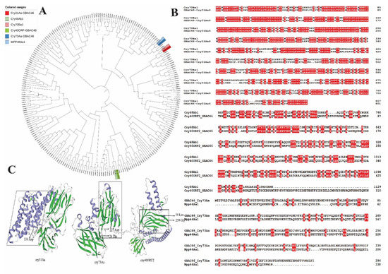 Phylogenetic tree construction was based on the sequence alignment of full-length Cry31Aa and familiar Cry protein (A); the amino acid sequences alignment of the Cry31Aa, Cry73Aa, and Cry40ORF proteins (B); three-dimensional structure prediction of the three Cry proteins in the GBAC46 strain (C).
