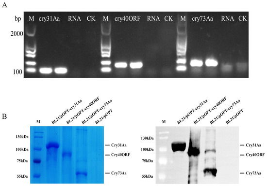 Detection of Cry protein genes and the identification of BL21 E. coli using the pOPT E. coli expression vector. (A) Detection of the transcription of Cry31Aa through RT-PCR. Total RNA was extracted from GBAC46 and BL21/pOPT. cDNA was used as a positive control, and RNA was used as a negative control. (B) SDS-PAGE expression analysis of Cry proteins (i.e., Cry31Aa, Cry40ORF, and Cry73Aa) after IPTG induction at 16 °C for 16 h. Levels of the three Cry proteins encoded by BL21/pOPT detected via Western blotting. The experiments were repeated independently three times.