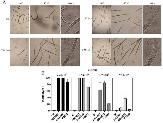 The nematicidal activity of the selected Bt strains against A. besseyi in vitro was evaluated through a 96-well plate. The plate counting method was used to detect the concentrations of strains being treated with nematodes at different gradients. After 24 h of incubation at 20 °C, the GBAC46, NMTD81, and FZB42 strains showed strong changes in their ability to kill A. besseyi, up to 88.80, 82.65, and 75.87%, respectively, compared to the control as shown in Figure 3A. If the nematodes were unable to restore movement after being touched with a needle under a microscope, they were considered dead. In addition, various concentrations in CFU/mL of the selected strains were used. The results showed that with a high concentration in CFU/mL, the mortality rate of A. besseyi was 100% compared to the control, ddH2O, as shown in Figure 3B.