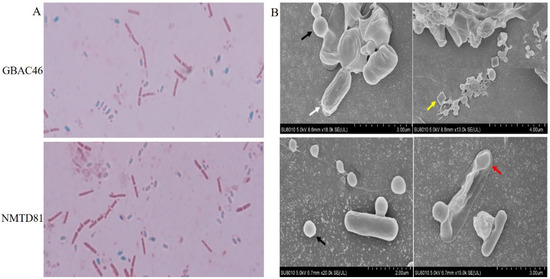 Detection of spore formation in GBAC46 and NMTD81 strains: (A) different colors represent different cells: blue—spores, red—living cells under the microscopic study; (B) observation of spore and crystal proteins in selected strains under a SEM. White arrow—spores; black arrow—circular crystal proteins; yellow arrow—bipyramidal crystal proteins; red arrow—irregular crystal proteins.