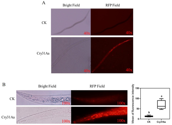 Observation of Cry proteins absorbed by A. besseyi: (A) the nematode A. besseyi after being treated with PBS as a control and rhodamine-labeled Cry31Aa were observed in bright and red fields; (B) the Cry31a protein produced the pore-formation toxin exposed to A. besseyi after staining with propidium iodide (PI), and fluorescence microscopy was used to monitor the signal of PI. The bright and red fields clearly indicate the changes in the intestinal cells. Different letters indicate significant differences at p < 0.005.